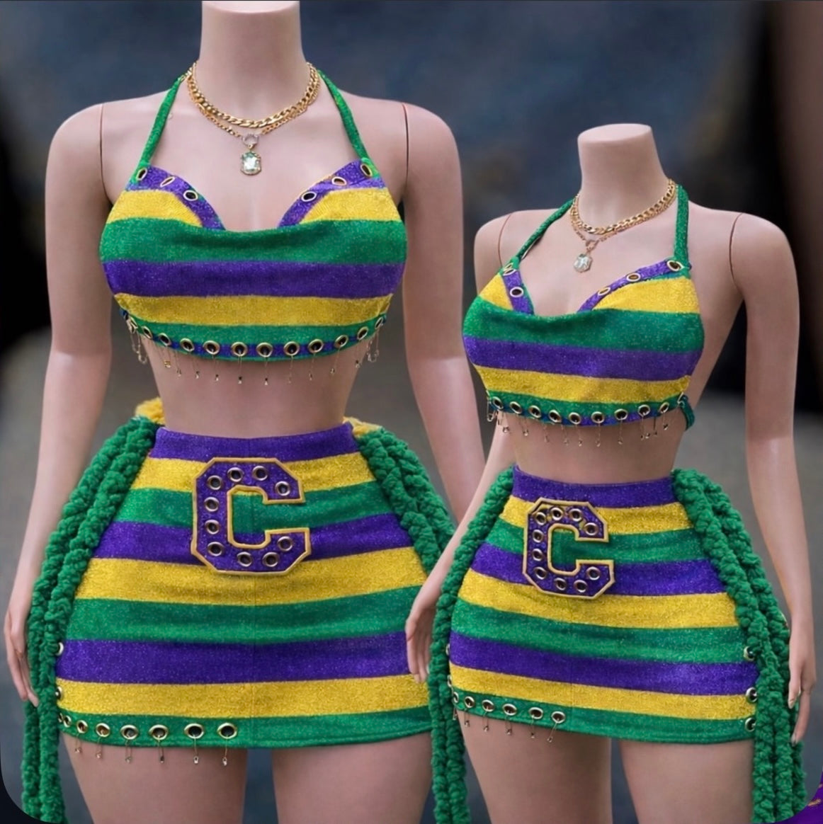 • Skirt: A fitted mini skirt that matches the same striped Mardi Gras color pattern. The standout detail is a large letter “C” patch centered on the waist, outlined with metallic eyelets for a custom, designer look. The skirt hem also includes grommets with subtle dangling hardware for cohesion with the top.
