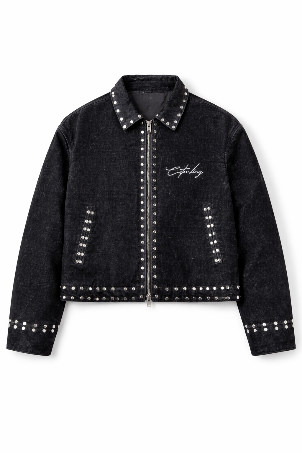 The jacket has a full front zipper, two angled front pockets, and a clean tailored silhouette that sits right at the waist. On the left chest, there’s a script-style embroidered logo, adding a refined, signature touch that contrasts nicely with the rugged studs.